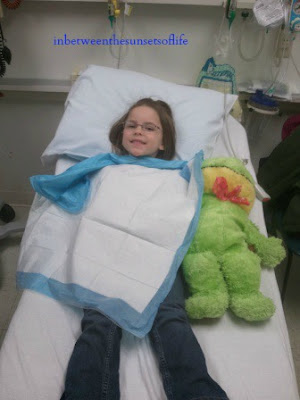 She calmed down on the way there and I tried to explain about stitches and "glue" that they might use, while holding a Kleenex on her now injured body part. She was chatting away, yet not moving her head, just holding it in the same position as when we left the house. I guess she thought it was going to hurt more if she moved it. It looked like she had a stiff neck or something! I didn't bother to ask because I was too busy explaining "what might happen"! I could say I was preparing her for what lies ahead for her own good, but mostly I was probably trying to make myself feel better. Do you see where this is going?